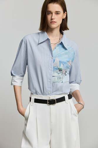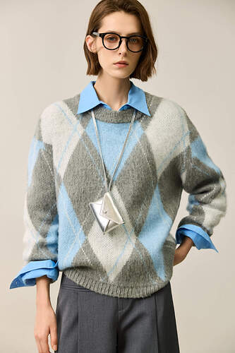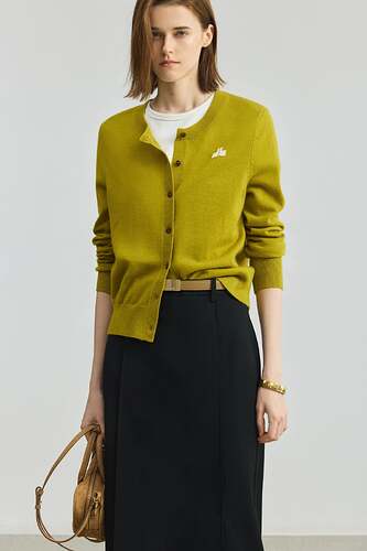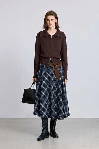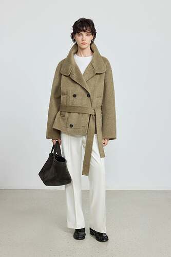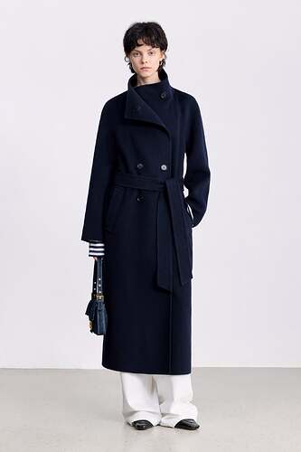 The long, stand-up collar coat features a straight shoulder design, creating a three-dimensional silhouette. Its clean, sleek tailoring exudes a calm and composed aura. The double-breasted design with a waist tie allows for effortless curves,...